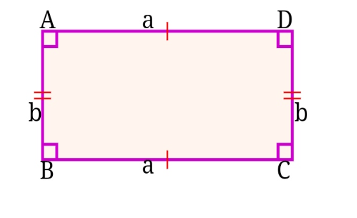 আয়তক্ষেত্রের বিপরীত বাহুদ্বয় পরস্পর সমান। মনেকরি ABCD আয়তক্ষেত্রের দৈর্ঘ্য AB = CD = a এবং প্রস্থ BC = AD = b.