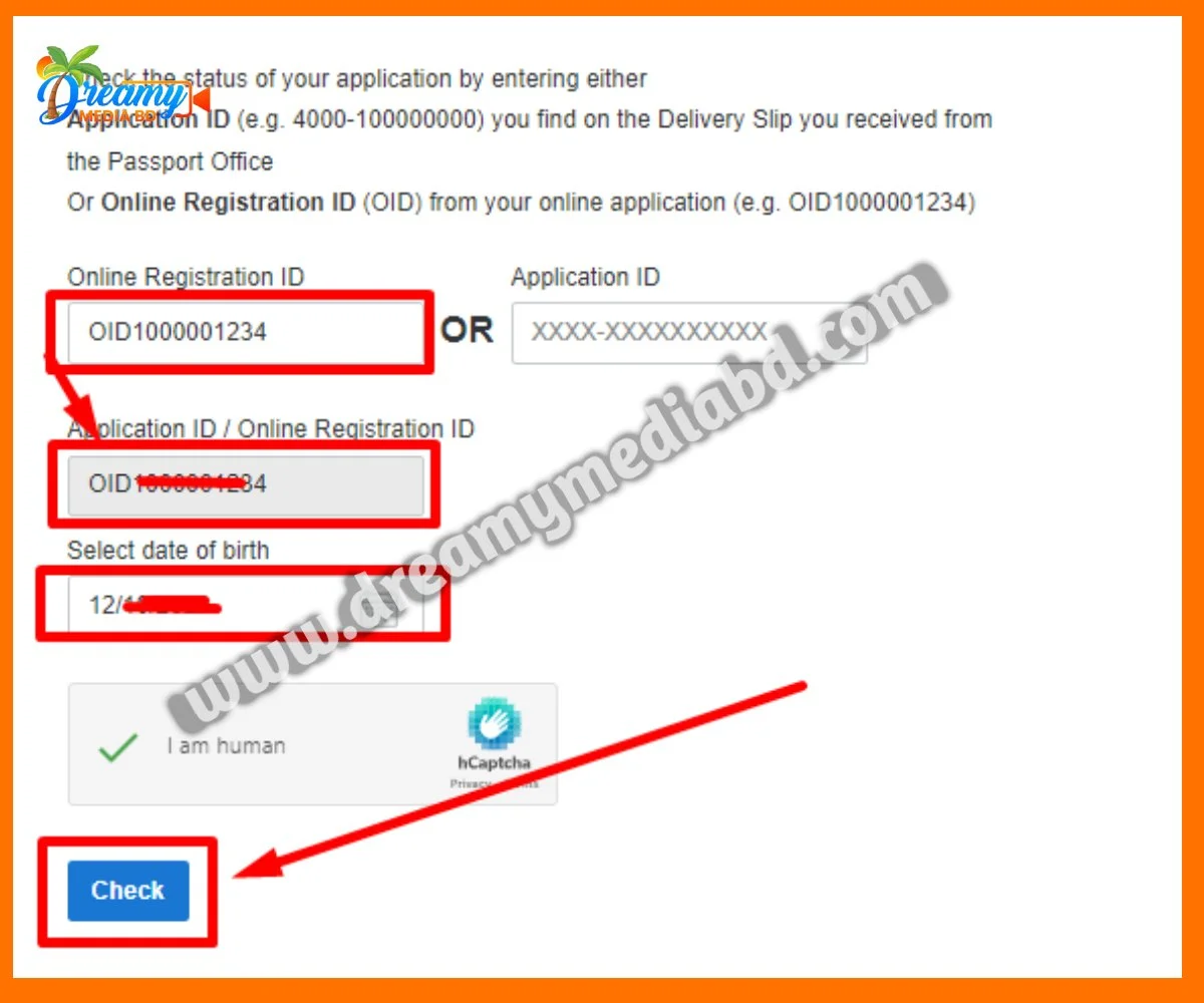 - অনলাইনে: বাংলাদেশ সরকারের পাসপোর্ট ও ভিসা অধিদপ্তরের ওয়েবসাইটে যান। “Check Application Status” অপশনে ক্লিক করুন। আপনার OID এবং জন্ম তারিখ প্রবেশ করুন। “Check” বাটনে ক্লিক করুন।