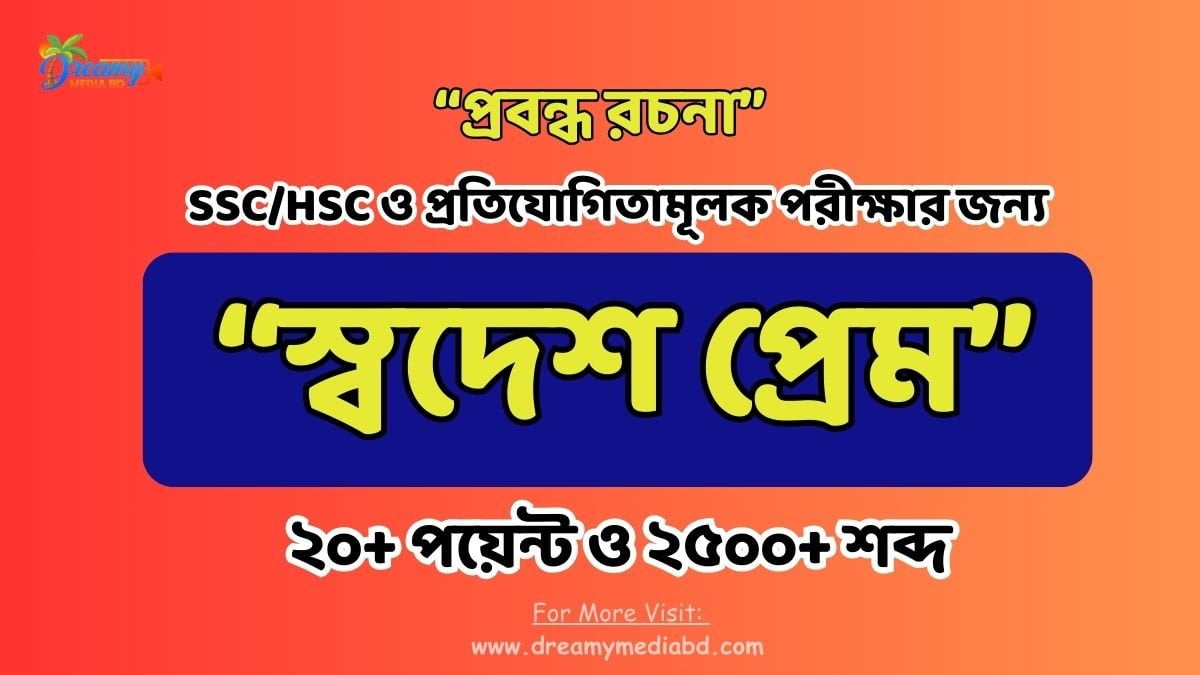 প্রিয় শিক্ষার্থীরা আমাদের আজকের রচনা ‘স্বদেশ প্রেম ‘। আজকের এই রচনাটি ২০ টি পয়েন্টে প্রায় ২৫০০+ শব্দে লেখা হয়েছে যেন পরীক্ষার্থীরা একবার পরেই নিজের মতো করে লিখতে পারে। রচনাটিতে প্রাসঙ্গিক অনেকগুলি উক্তি ও কবিতা ব্যবহার করা হয়েছে যা শিক্ষার্থীদের পরীক্ষায় সর্বাধিক নম্বর অর্জনে সাহায্য করবে। রচনাটি সহ যে কোন প্রতিযোগিতামূলক পরীক্ষার জন্য অত্যান্ত গুরুপ্তপূর্ণ।
